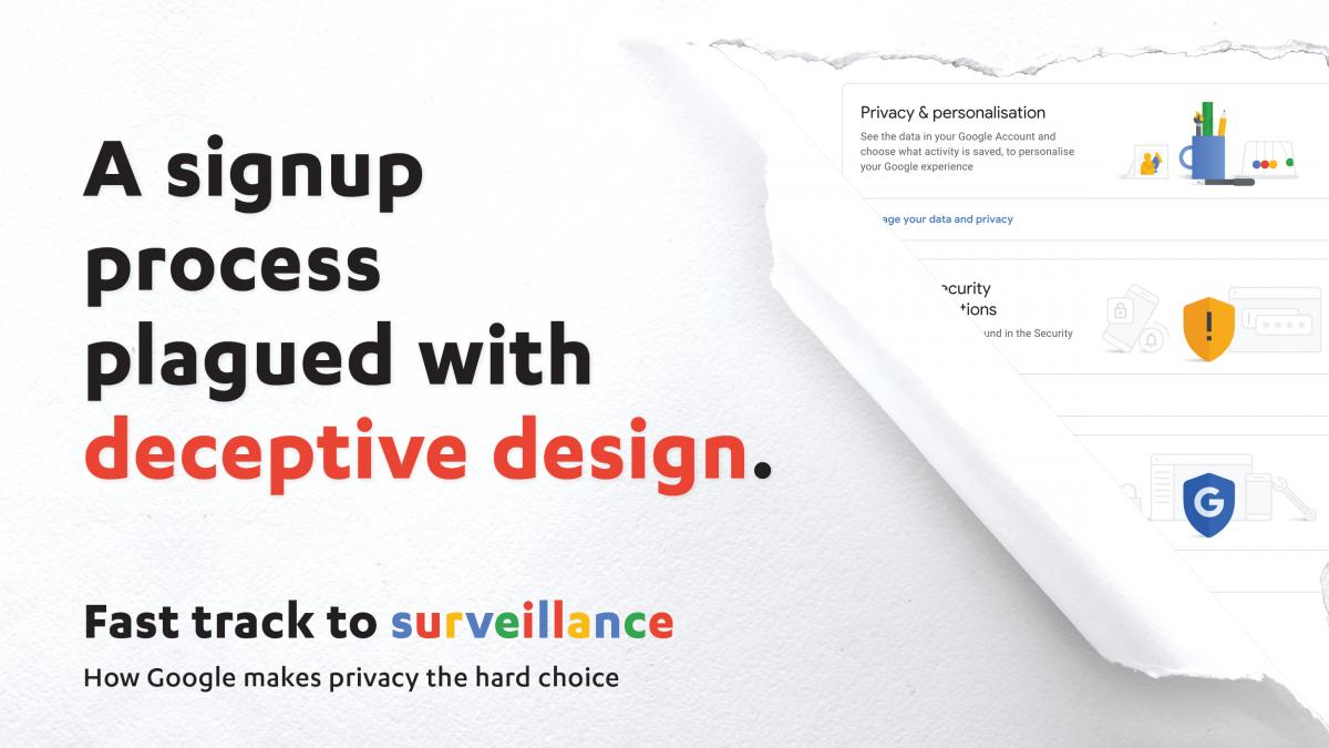 Tech giant Google unfairly steers consumers towards its surveillance system when they sign up to a Google account, instead of giving them privacy by design and by default as required by the General Data Protection Regulation (GDPR).