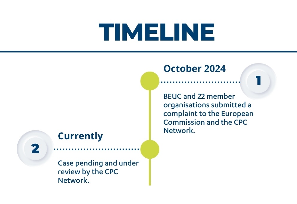 This alert to the CPC-Network and the European Commission is coordinated by BEUC together with 22 members representing 17 European countries, namely Testachats / Testaankoop (Belgium), Bulgarian National Consumers Association (BNAAC) (Bulgaria); Kypriakos Syndesmos Katanaloton – CCA (Cyprus); Forbrugerrådet Tænk, (Denmark); CLCV and UFC-Que Choisir (France); Kuluttajaliitto ry (Finland); vzbv (Germany), EKPIZO and KEPKA (Greece); Adiconsum and Altroconsumo (Italy), Consumentenbond (the Netherlands); Forbrukerrådet (Norway); Federacja Konsumentow - FK (Poland); DECO (Portugal), Spoločnosť ochrany spotrebiteľov (S.O.S.) Poprad (Slovakia) ; Sveriges Konsumenter (Sweden); ASUFIN, CECU and OCU (Spain); Fédération romande des consommateurs – FRC (Switzerland).