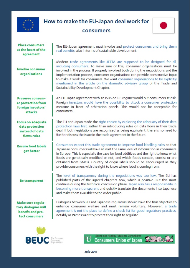 Technical negotiations are about to start between the EU and Japan to fine-tune their future trade agreement. Today, Consumers Union of Japan (CUJ) and The European Consumer Organisation (BEUC) sent recommendations to negotiators on how to ensure these talks lead to an EU-Japan trade deal that works for consumers.