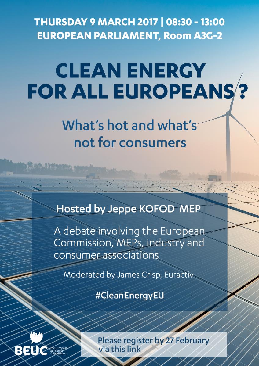 ‘Clean Energy for all Europeans? What’s hot and what’s not for consumers’ will be a debate between Commission representatives, Members of the European Parliament, industry associations and consumer organisations. The event will include testimonies from consumer organisations across Europe. Anybody unable to attend is warmly invited to send in a question they have on Twitter using #CleanEnergyEU and your question may be answered by our panel speakers.