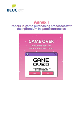 Annex 1 compiles screenshots of all targeted traders in-game purchasing processes with their premium in-game currencies. The document highlights that consumers have no equivalence in real currency before making in-game purchases of digital content. Instead, they must buy digital content using premium in-game currencies (sometimes multiple).