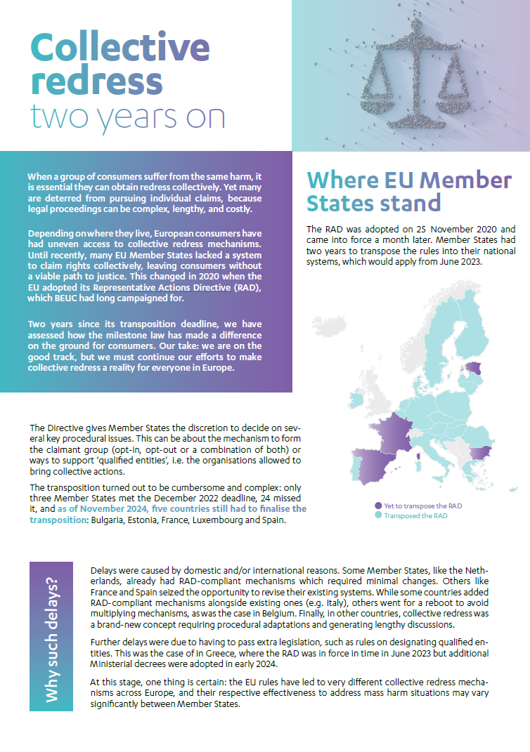 Depending on where they live, European consumers have had uneven access to collective redress mechanisms. Until recently, many EU Member States lacked a system to claim rights collectively, leaving consumers without a viable path to justice. This changed in 2020 when the EU adopted its Representative Actions Directive (RAD), which BEUC had long campaigned for.