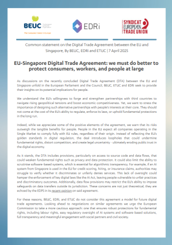 As discussions on the EU-Singapore Digital Trade Agreement (DTA) continue, BEUC, ETUC, and EDRi shed a light on the potential risks the agreement poses to consumer rights, workers’ protections, and broader fundamental rights.